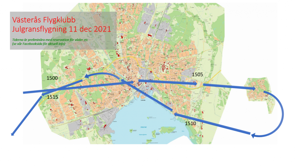 För sjätte året i rad kommer piloter från Västerås Flygklubb att bjuda Västeråsarna på en uppvisningsflygning i form av en ”Julgran”. Det är en formation bestående av 10-13 klubbflygplan, som genomför flygningen i skymningen på lördag 11/12.